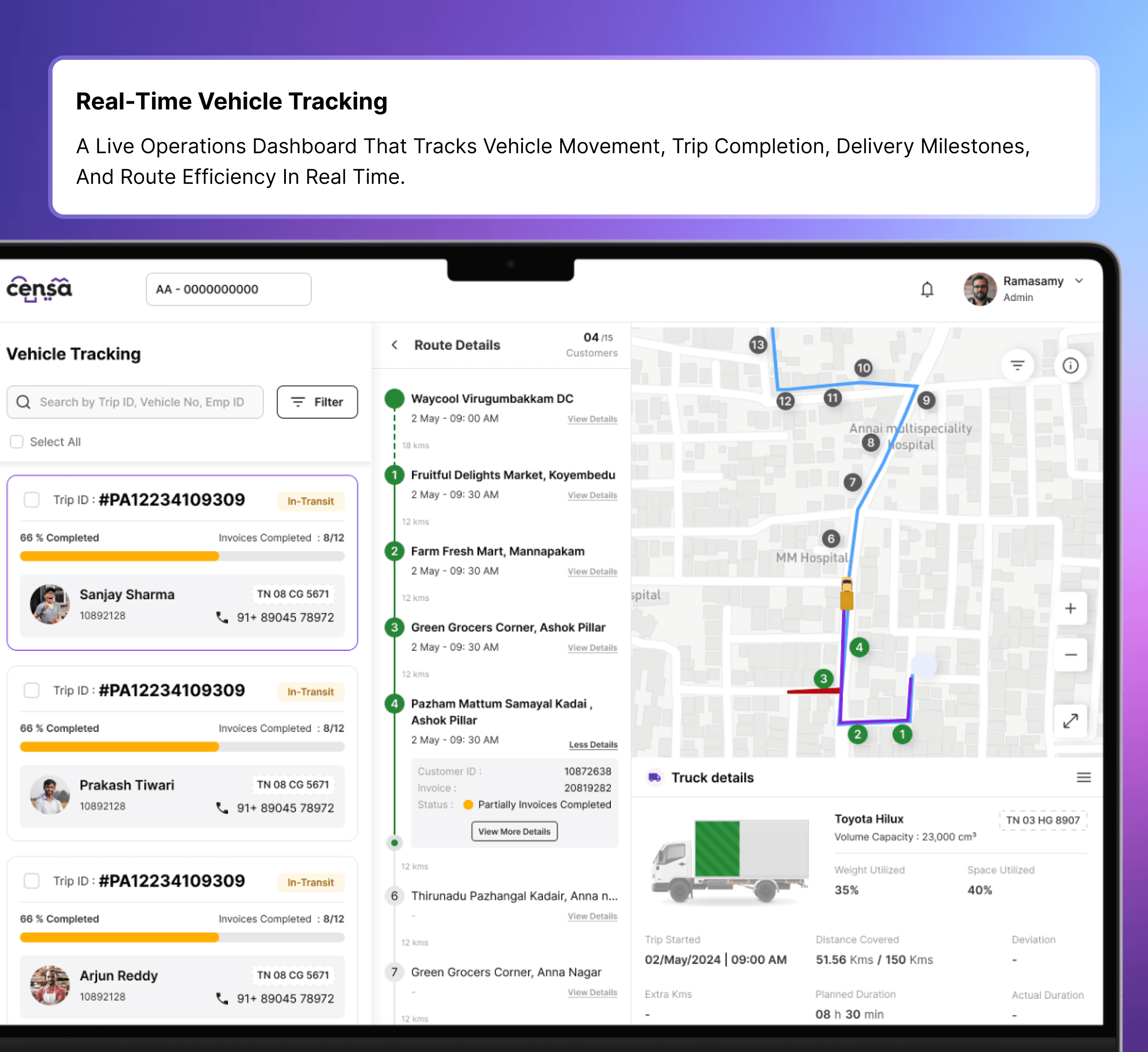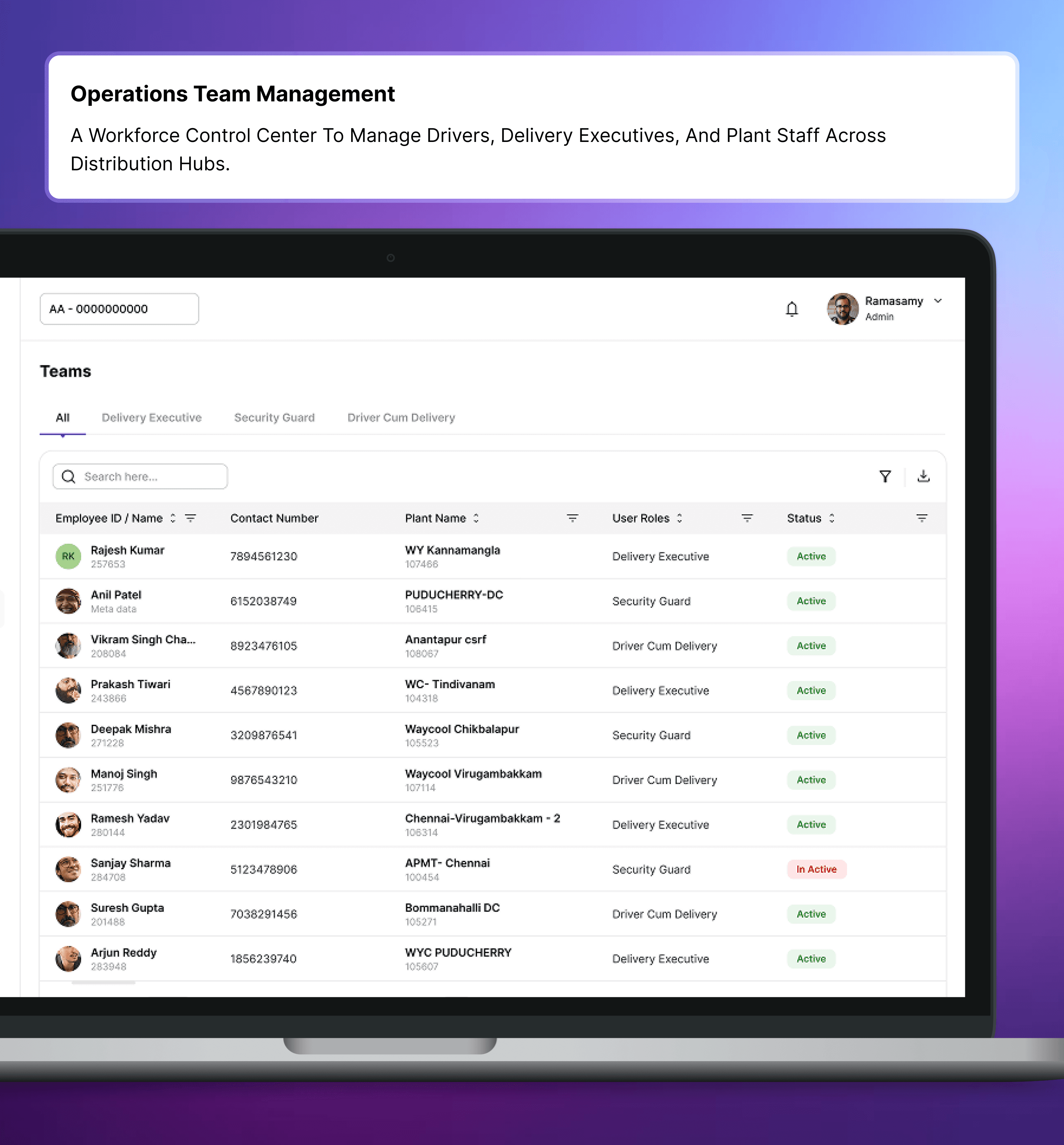 A workforce control center to manage drivers, delivery executives, and plant staff across distribution hubs.