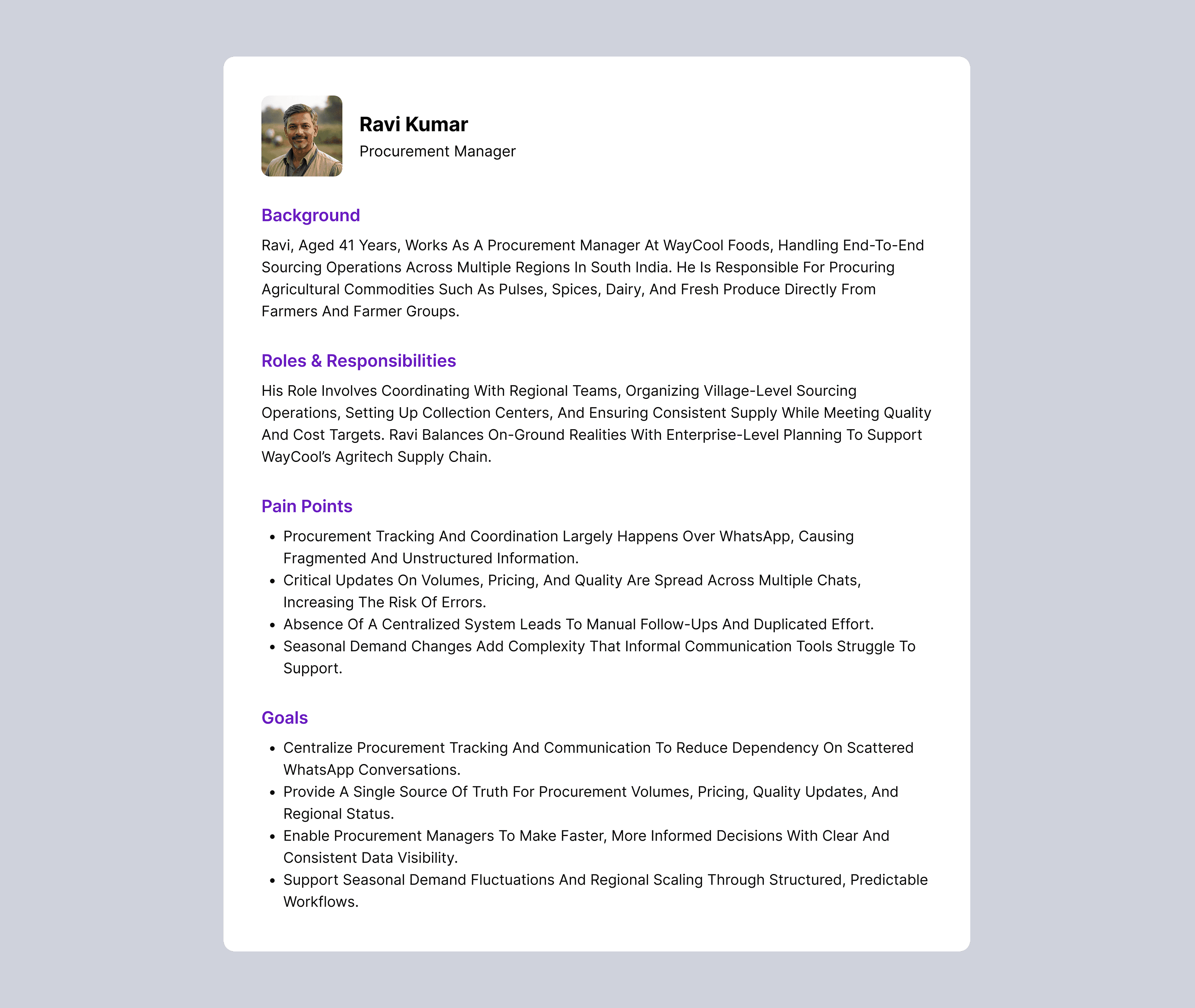 This persona represents the primary user group for the procurement platform and informed key design decisions around consistency, hierarchy, and workflow clarity.